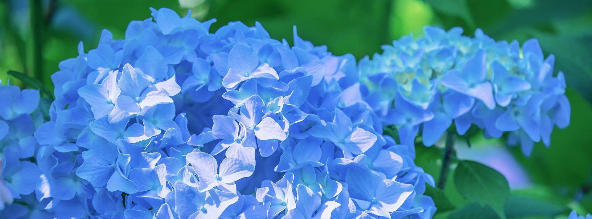 紫陽花の歴史は大変古く、『万葉集』にも詠まれています。梅雨から盛夏にかけて咲く紫陽花は夏のモチーフではありますが、五月雨に濡れた様子を描いたものも多く見受けられます。現代では趣味の着物や帯、浴衣などに多く用いられていますが、かつては能装束などにも見ることができました。