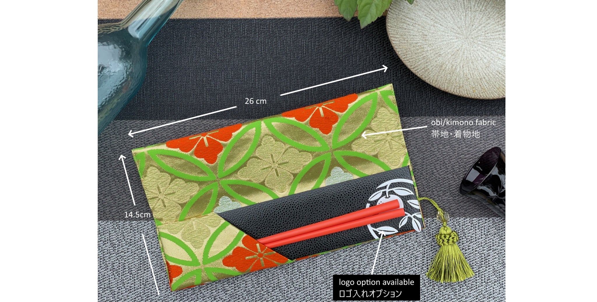 ☛ お箸だけでは寂しい、既存の箸袋を使うにもサイズや色合いがマッチしないというご不満があったり、その箸袋も使い捨てのものを使用してしまっているという店舗様も多いのではないでしょうか?そこで、弊社はオリジナルの純和風マイ箸ケースをご提供します。写真イメージのとおり、純和風のイメージを演出するのに最適です。