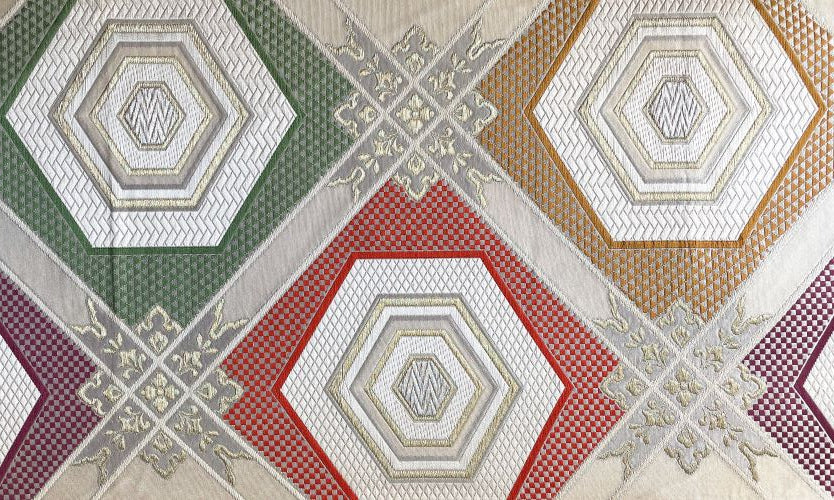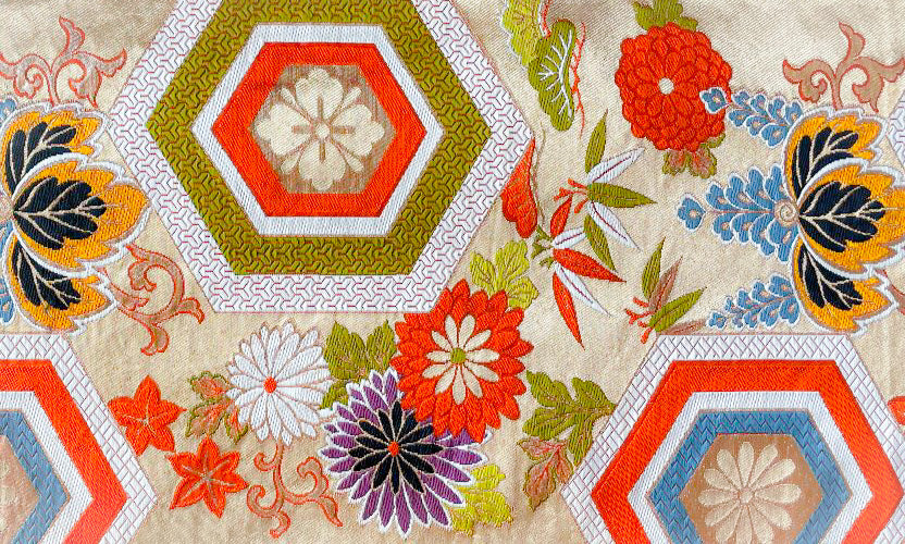 The "Kikkō-mon" pattern, believed to have originated in West Asia and later transmitted to Japan from China and Korea, was originally a geometric design. After its introduction to East Asia, its resemblance to a tortoise shell led to its name. From the Heian period onwards, it featured in the Yūsoku Bunka (court ceremonial culture) as one of the designs that incorporated elements like flower diamonds, chrysanthemums, and cranes. Today, it remains a traditional auspicious pattern, commonly seen on formal kimono and obi. When the Kikkō pattern is repeated in a continuous fashion, it is often referred to as "Wari-tsuke" pattern.