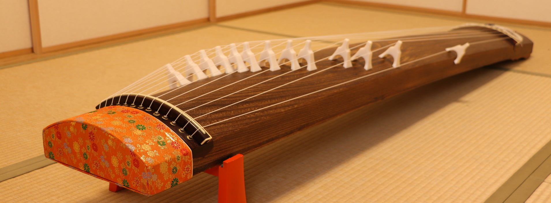 原型となる楽器の残片が弥生時代の遺跡から見つかるなど、琴は大変古くからある日本の伝統楽器です。細長い形は文様としても印象的で、現在も着物や帯に用いられています。また、琴の音程を調節する道具である「琴柱」は、その美しい曲線が好まれ単体でも文様のモチーフとなっています。