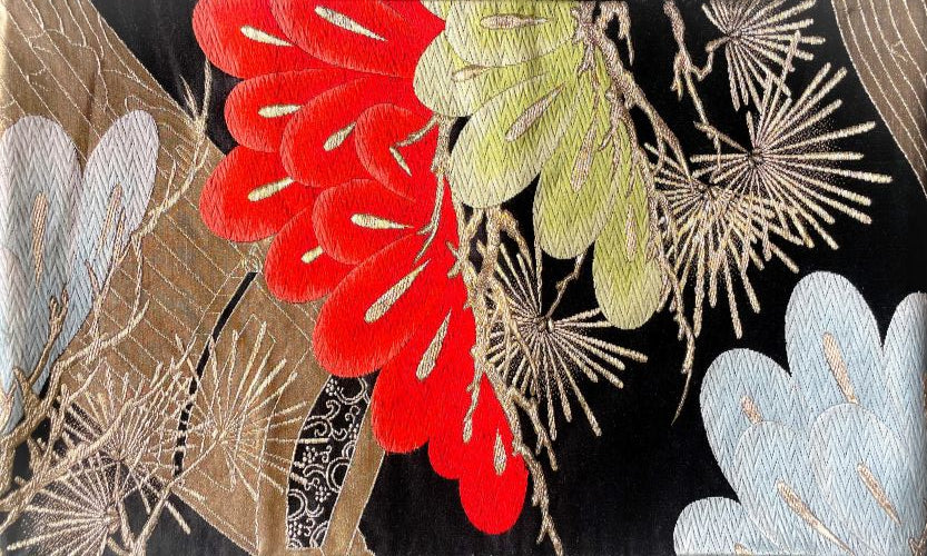 "The koto," a traditional Japanese instrument, has ancient roots dating back to the Yayoi period, with fragments of the instrument found in archaeological sites. Its distinctive elongated shape is visually striking, making it a popular motif in traditional Japanese patterns. Even today, it is used in designs for kimono and obi. Additionally, the "koto-bashira," the tool used to adjust the pitch of the koto strings, features elegant curves that are appreciated as a standalone motif in various patterns.