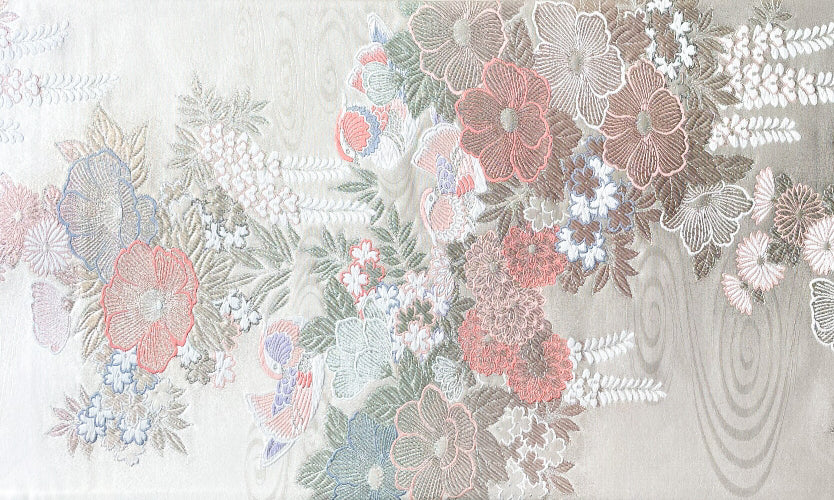着物や帯に描かれる流水は、多くが小川を表していると考えられていますが、一方で、一滴の水が海に注ぐまでを人生に見立てるなど、多様な表現を見ることもできます。「茶屋辻」や「御所解き文様」などの風景文様、「杜若」や「菖蒲」など、流水との組み合わせが定番となっている文様は数多くあります。