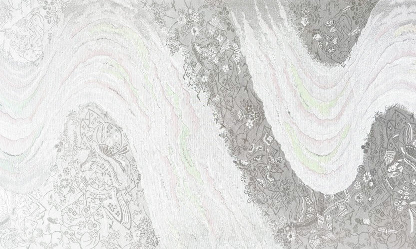 着物や帯に描かれる流水は、多くが小川を表していると考えられていますが、一方で、一滴の水が海に注ぐまでを人生に見立てるなど、多様な表現を見ることもできます。「茶屋辻」や「御所解き文様」などの風景文様、「杜若」や「菖蒲」など、流水との組み合わせが定番となっている文様は数多くあります。