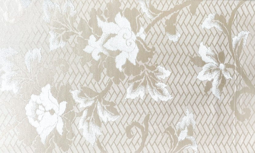 薄く削った檜を網代のように組んだ垣根「檜垣」をモチーフにした幾何学的な文様。着物や帯、白生地の地紋として多く用いられています。菊唐草や梶の葉を散らしたものなど、さまざまな表現を見ることができます。