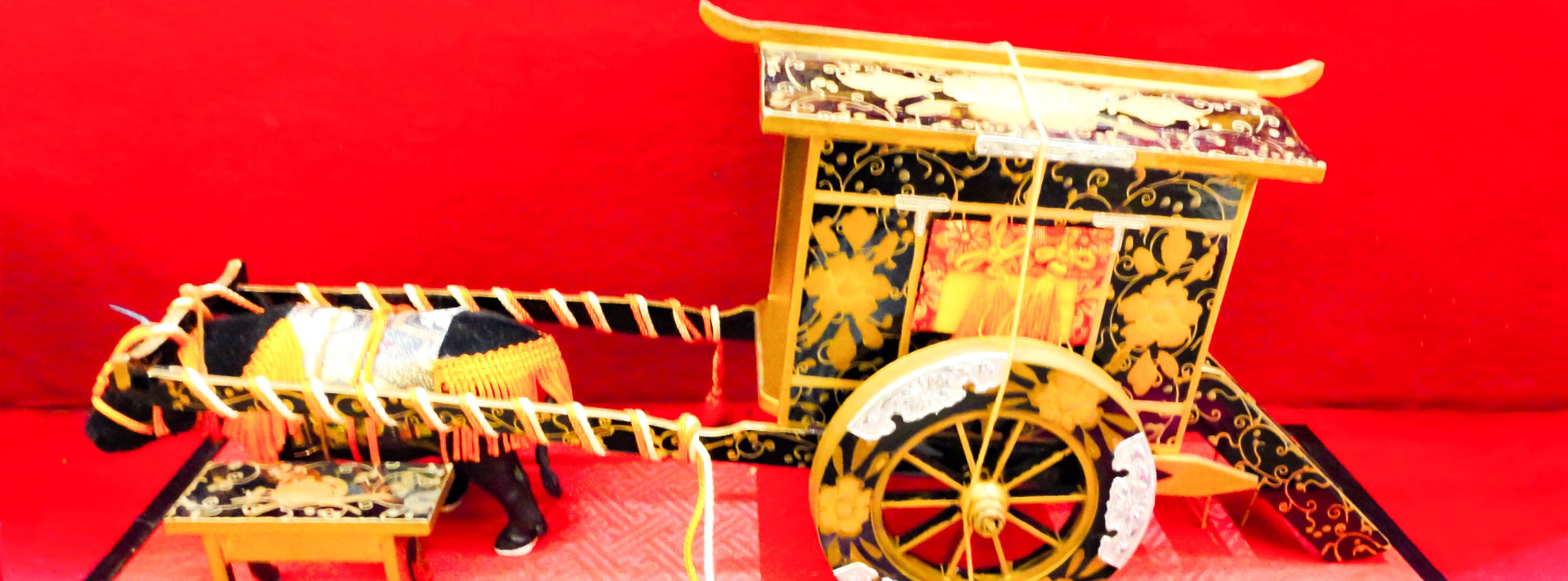 平安時代の貴族の乗り物で「源氏物語」の世界を象徴するもので「源氏車」とも呼ばれます。