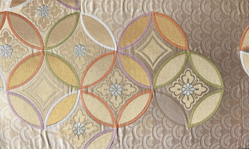 同じ大きさの円を、円周の4分の1ずつ重ねた文様で、輪違いと呼ばれる有職文様でもあります。七宝とは金、銀、瑠璃、玻璃、珊瑚、瑪瑙、硨磲の7つの宝物を意味する仏教用語ですが、文様との関係は諸説ありはっきりとはわかっていません。