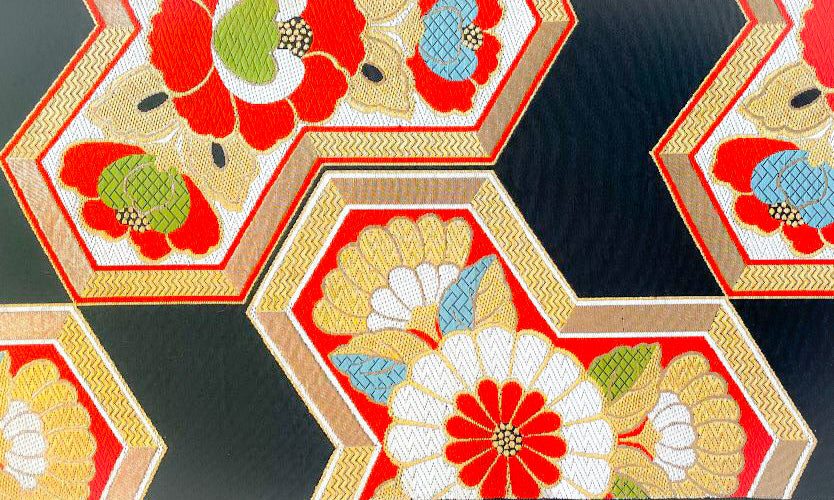 The geometric pattern resembling mountain ranges created by jagged lines is commonly known as "yamamichi/yamaji." Sometimes, a distinction is made by calling the acute-angled version "nokogiri-hamon." This pattern is frequently found in decorative borders, and its use extends to the main motifs in order to enhance the overall rhythm and unity of garments such as Noh costumes and kosode sleeves.